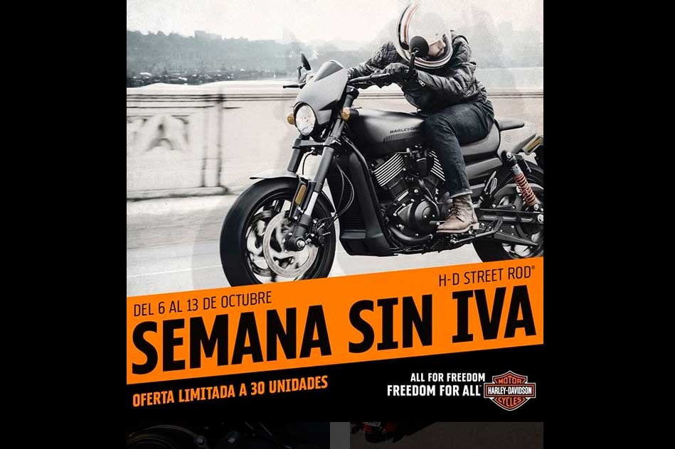 Todos los amantes de la marca americana y de las dos ruedas en general que deseen adquirir una Harley Davidson ahora es el momento de lanzarse a por ella. La semana sin IVA de Harley Davidson ofrece la Street Rod libre de este impuesto, una oportunidad única para aquellos que sueñen con conducir una moto de leyenda e introducirse en el universo Harley Davidson con este modelo idóneo para iniciarse en la conducción Harley.