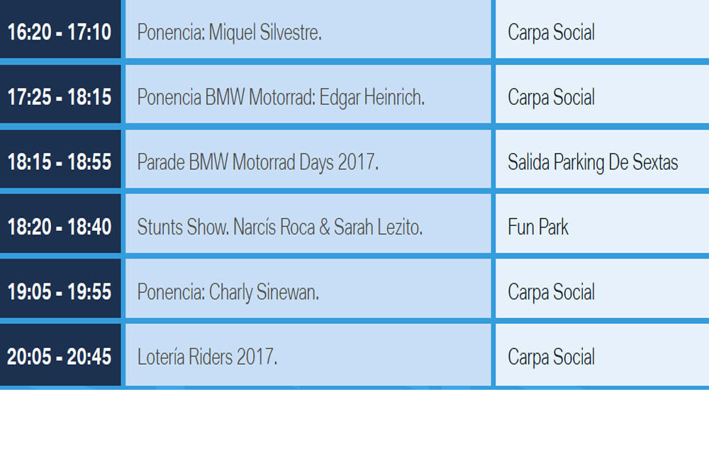 Esta edición contará con grandes novedades: por primera vez en España podrás disfrutar del Hover Ride Design Concept, la primera motocicleta voladora diseñada por BMW y LEGO; conocer de primera mano los lanzamientos de este 2017, alucinar con las acrobacias sobre 2 ruedas de nuestros stunt Narcís Roca y Sarah Lezito, además de probar la BMW que más te guste y muchas más sorpresas y actividades para toda la comunidad rider.